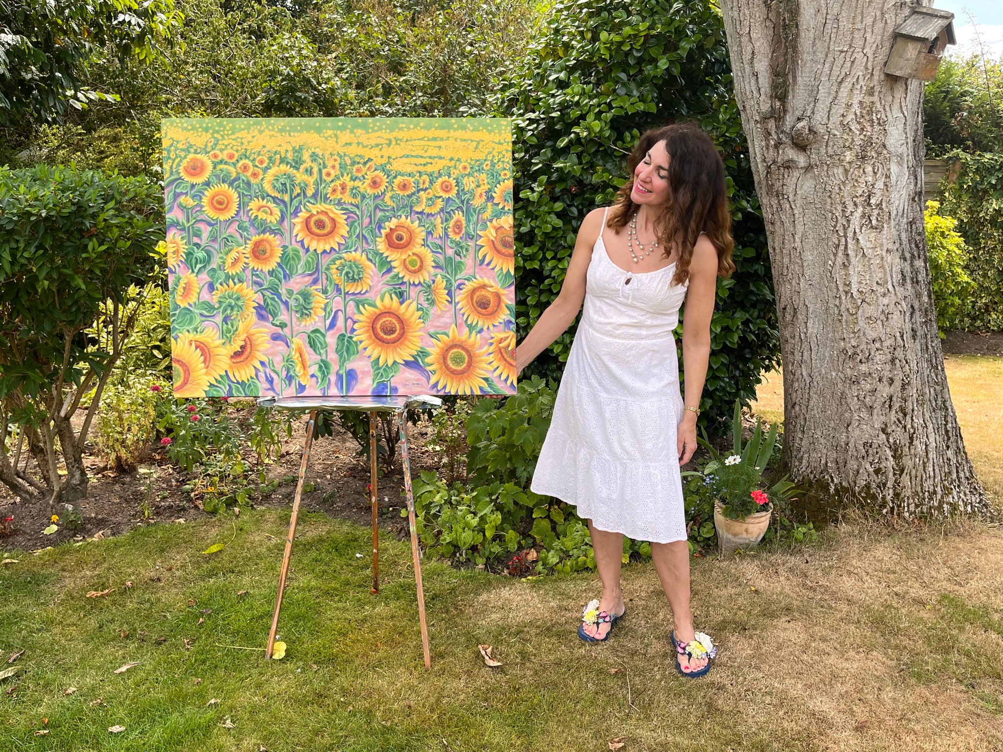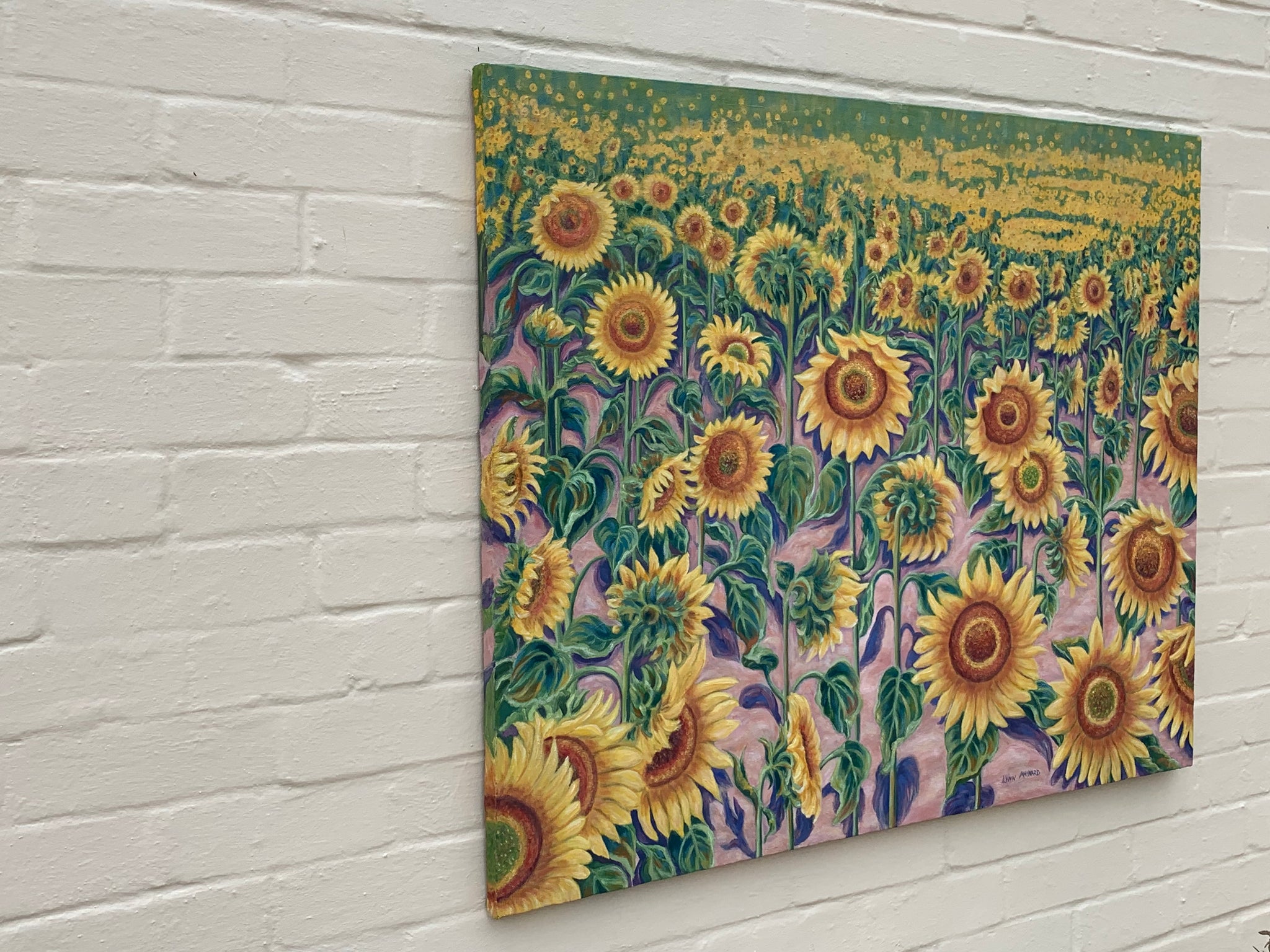‘Suffolk Sunflowers’ in Kirby, Suffolk. This scene was a ready-made subject presenting many possible compositions. I used oils and played with the perspective to emphasise the far-reaching vista of distant flowers versus those in the foreground . There is maximum impact with this large canvas, which is size 3’ x 4 ' making the viewer feel like they are among this field of bold yellow flowers.